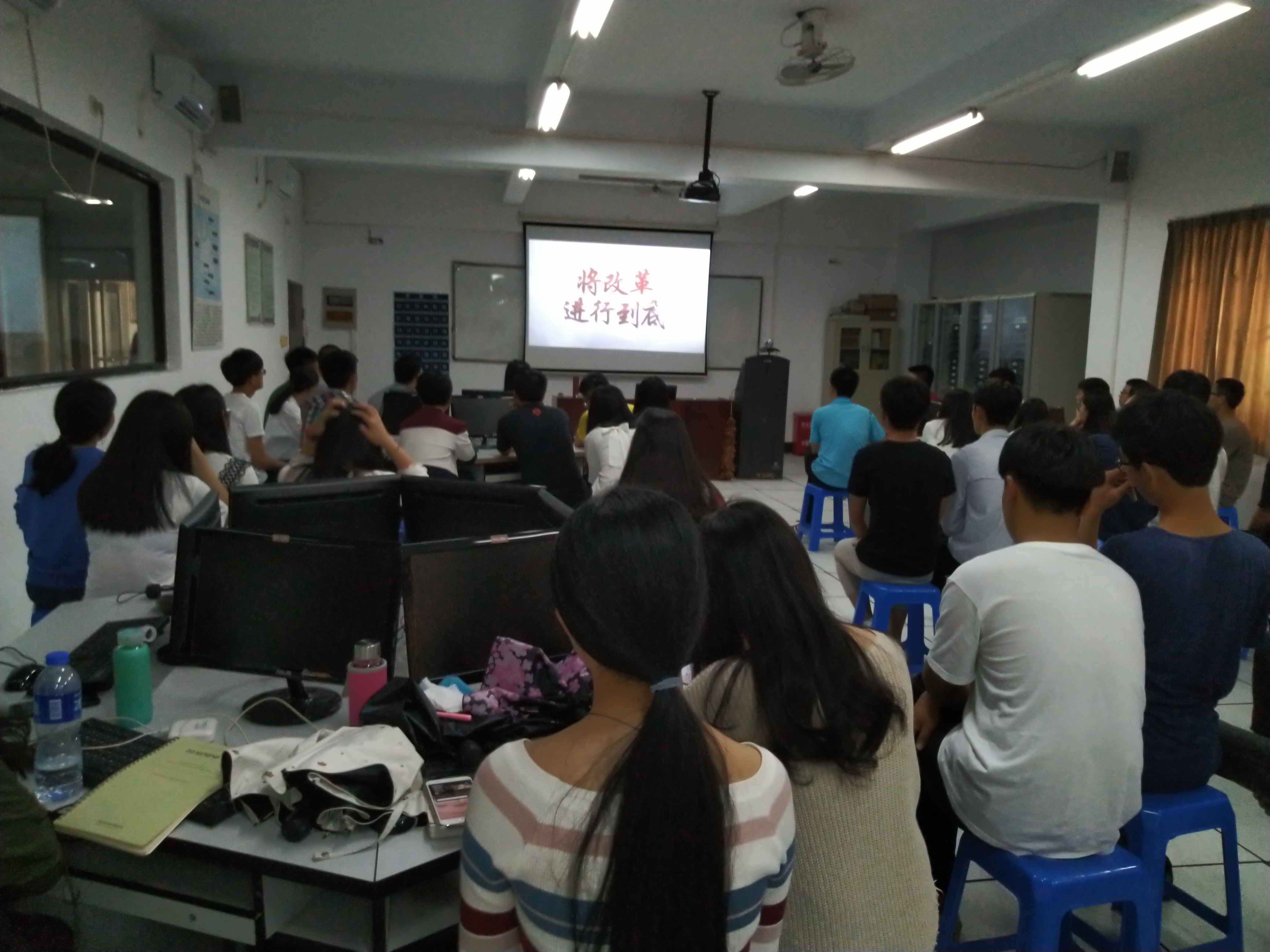 此次会议共进行三项议程。首先是欢迎新加入的支部成员,其次是带领同学们观看《将改革进行到底》系列宣传片,此次观影让支部全体师生,对全面深化改革各主要领域具有“四梁八柱”性质的改革主体框架已基本确立的过程,有了深入的了解。从生动的改革故事中,展现了党的十八大以来伟大改革进程给人民群众带来的获得感等。