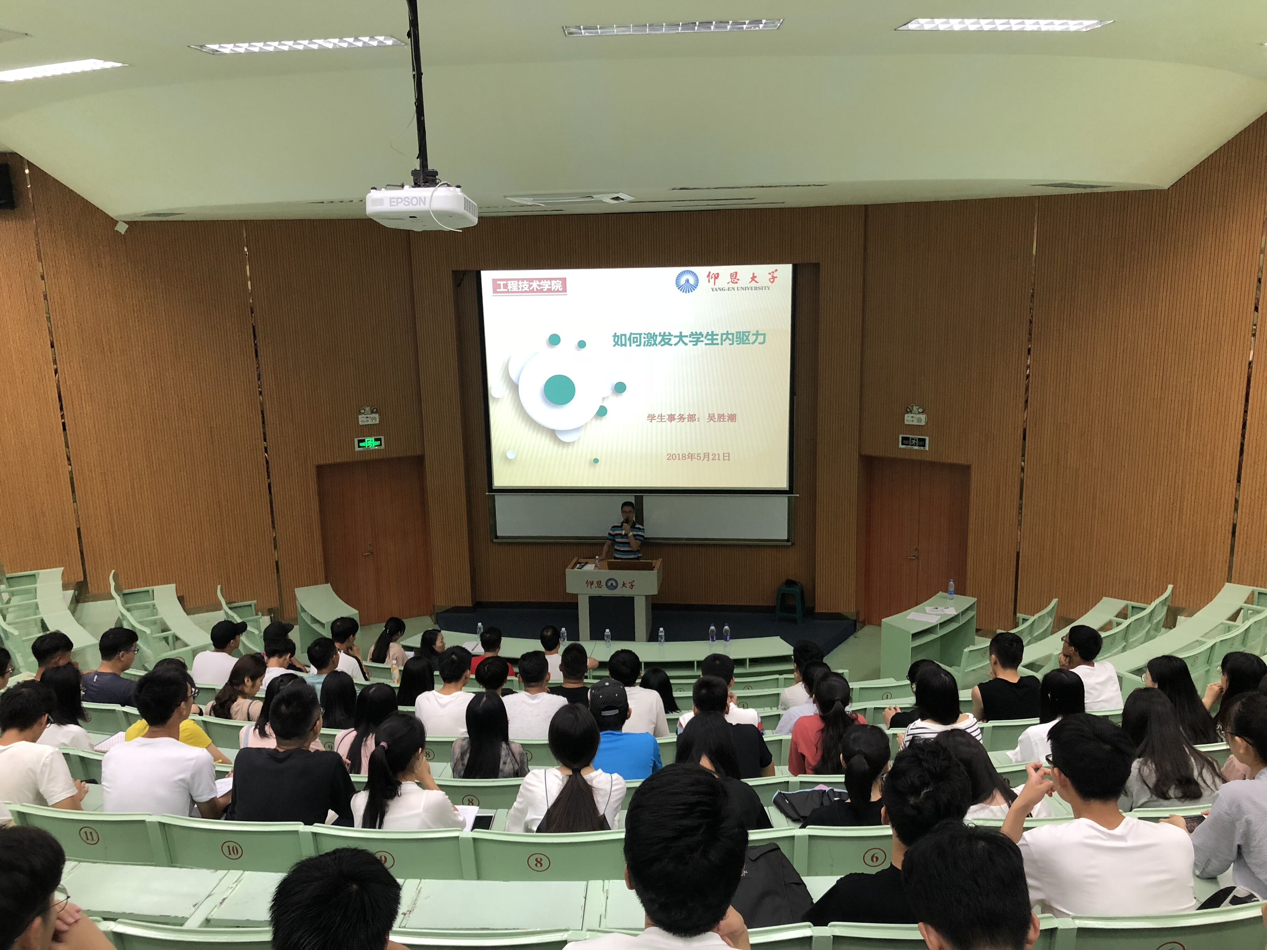 吴胜潮主任以如何激发自身内驱力为主题展开讲座,对今年会近阶段的学风改善给与了肯定,学风的改善离不开教师以及学院学生骨干的付出。以个别案例指出了当代大学生期望值不高,目标不明确,沉迷于游戏等一些现状。以罗格斯大学,麻省理工学院等美国高校例子进行对比,结合自己的经历与学生分享学生时代的学习生活。并对学生干部们提出几点建议首先要有居安思危的忧患意识,做好职业生涯规划,提高自身内驱力,才能时刻准备应对变化。其次学生干部应树立正确的自身价值观,严格要求自己,认真履行职责,发挥带头作用,注重自身修养提高工作效率,传帮带动下一届的学生。最后用“常怀感恩之心,心有敬畏二字,” 表达了对大家的期望,期待着各部门在学生工作方面取得长足进步。