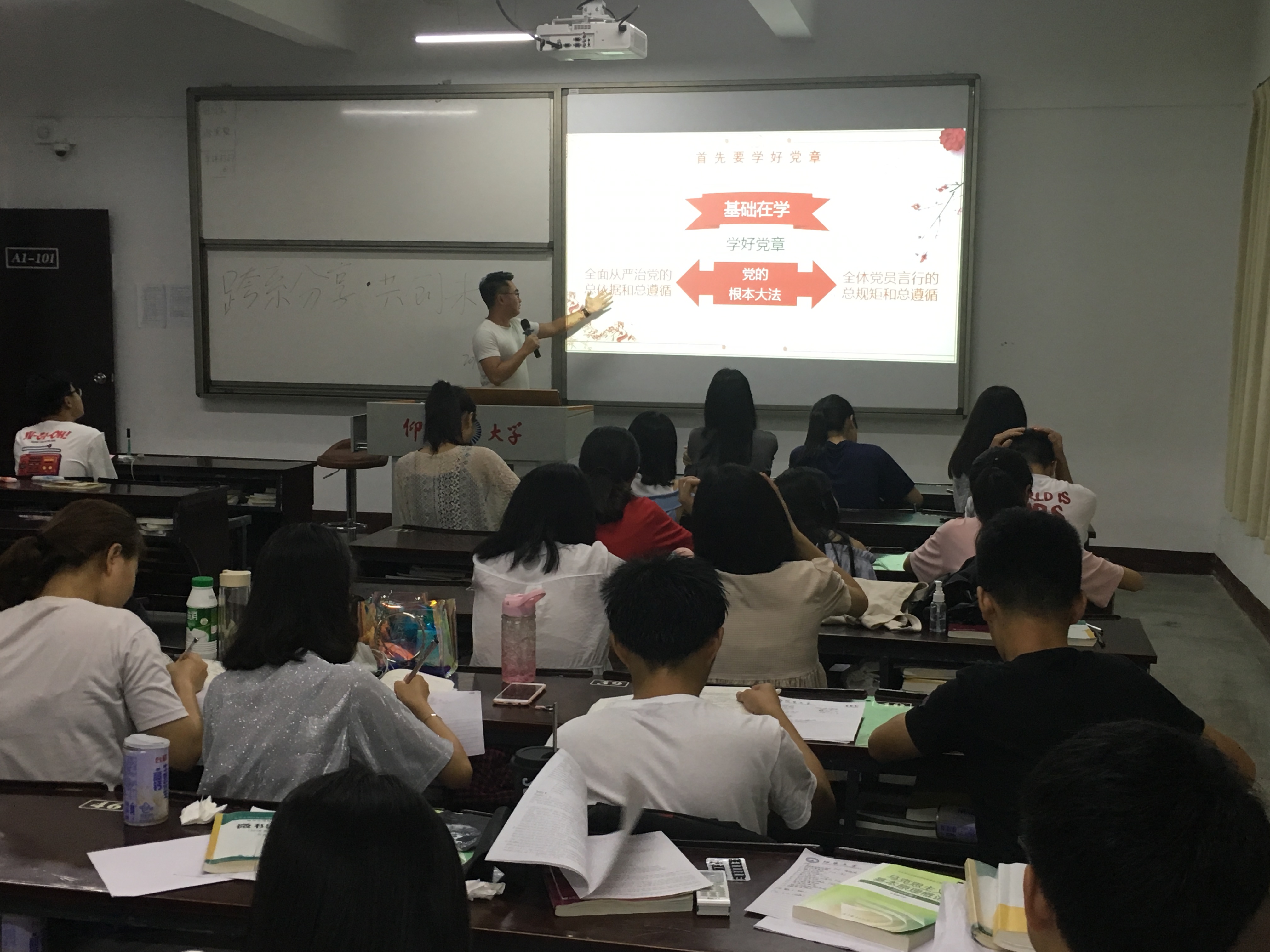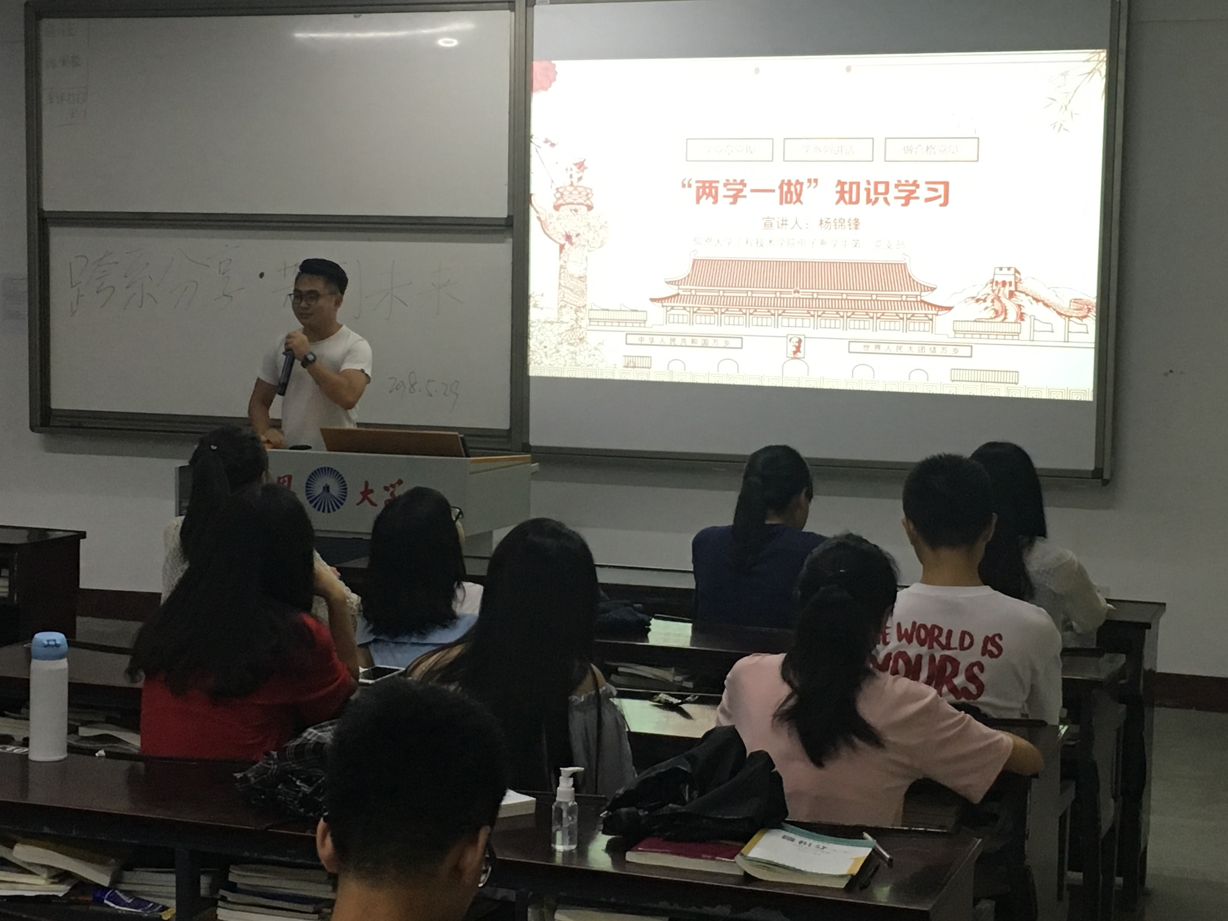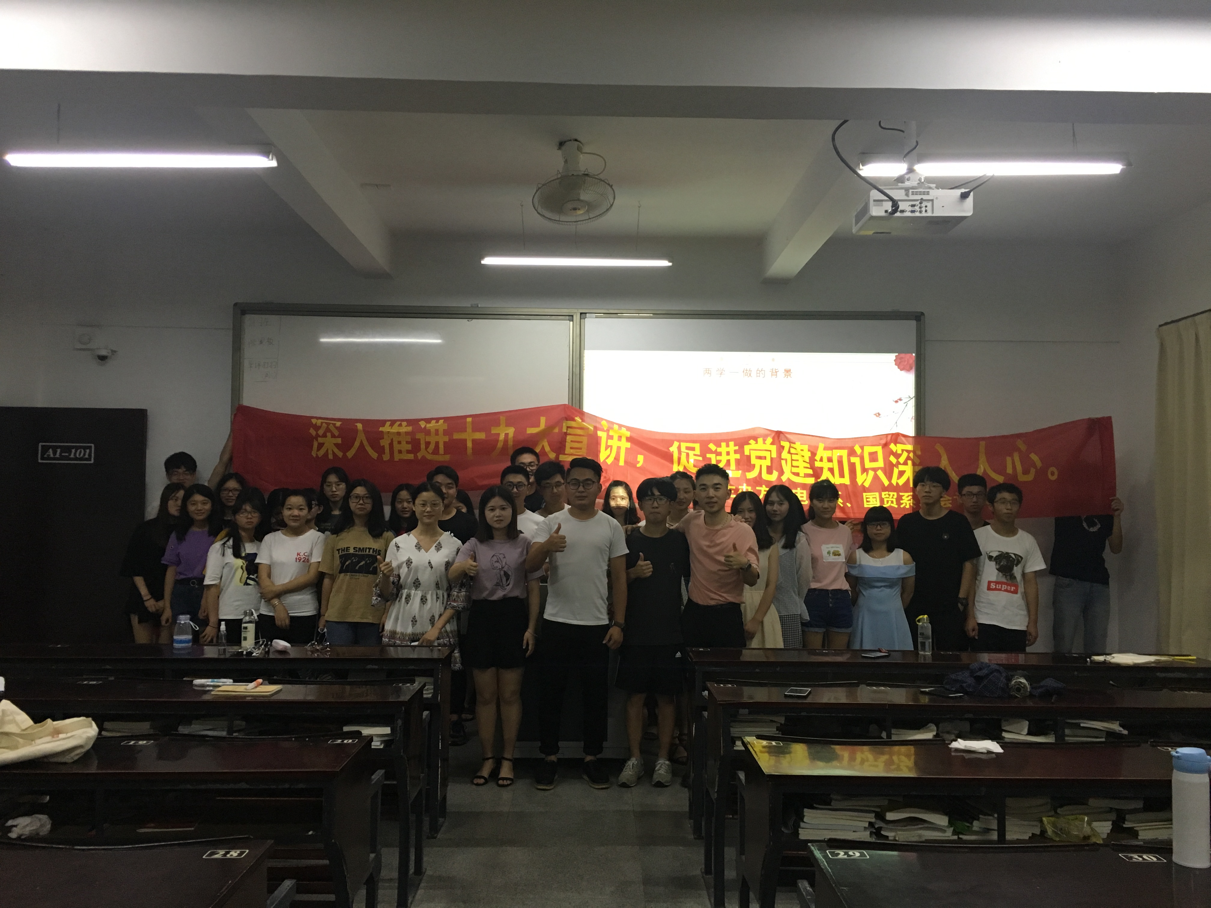 根据学院党总支要求各支部进行党支部立项活动,电子系学生第一党支部与国贸系、会计系一起开展“跨系分享·共创未来”讨论会,三个系支部分别在不同的班级进行宣讲讨论。2018年5月29日晚上jinnianhui今年会电子系学生第一党支部十九大宣讲小队对经济学院国际贸易专业的新生进行了党建知识的宣讲,出席本次活动的有经贸系学生第一党支部书记林晓富老师,三个系的活动负责人,以及经贸系17级全体学生。