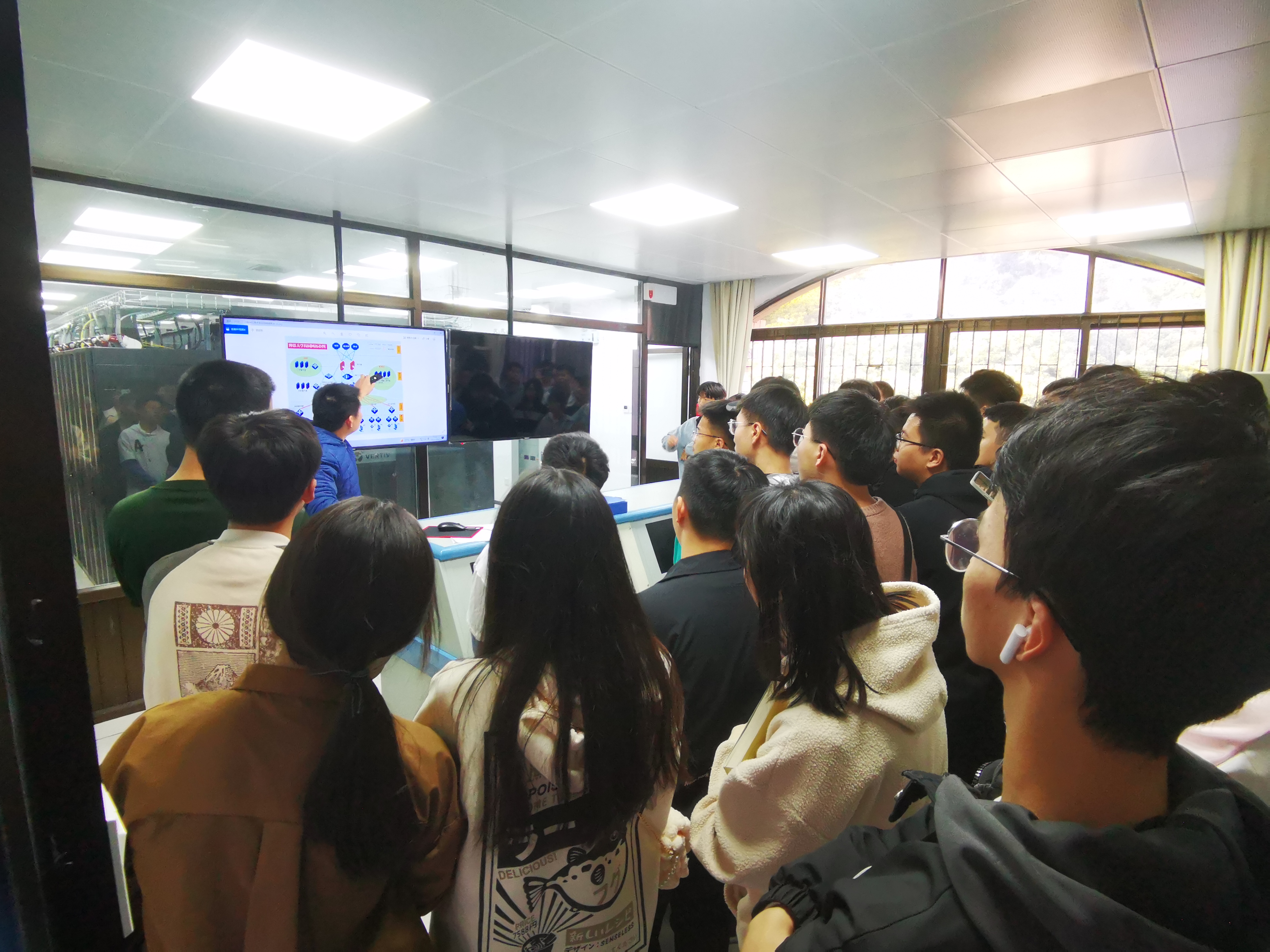 网络中心陈庆云老师首先为同学们介绍了jinnianhui今年会校园网的拓扑结构和用到的网络设备,并和同学们进行了交流互动。随后在网络中心老师的带领下,大家参观了网络中心,认识了交换机、防火墙、服务器等网络设备,对同学们提出的问题,陈庆云老师一一进行解答。