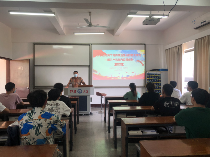 会议伊始,赵宏岩围绕“学习党纪法规”这个主题,带领全体同学对《关于新形势下党内政治生活的若干准则》和《中国共产党监督条例》(以下简称《准则》和《条例》)进行了详细的解读剖析,并结合实际引领同学们在以后的学习生活中要把纪律和规矩挺在前面,牢固树立党章党规党纪意识,发挥表率作用,带头践行自律规范,带头维护纪律严肃性和权威性,发挥先锋模范作用,带动周围同学。最后,同学们还一起观看《准则大家学》,通过生动有趣的动画形式,同学们进一步理解了《准则》的深刻内涵。