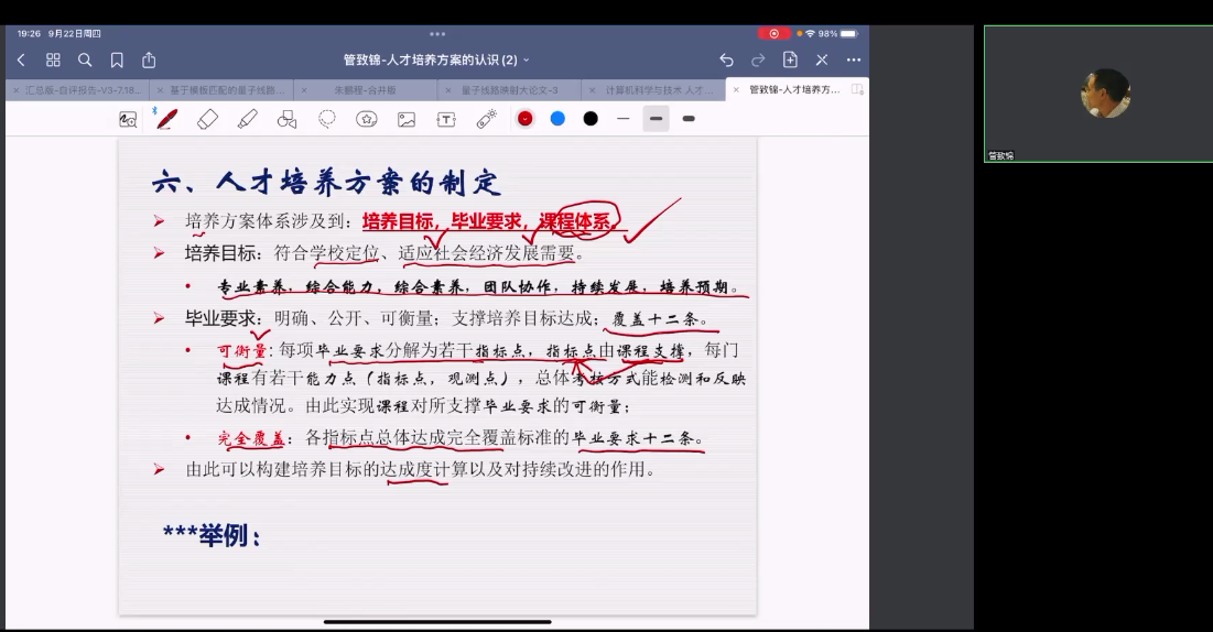 为了修订培养方案,制定符合工程教育认证标准的培养方案。9月22日,今年会召开线上新版培养方案学习交流会。交流会由管致锦教授主讲,院系领导、各专业负责人参加了本次交流会。