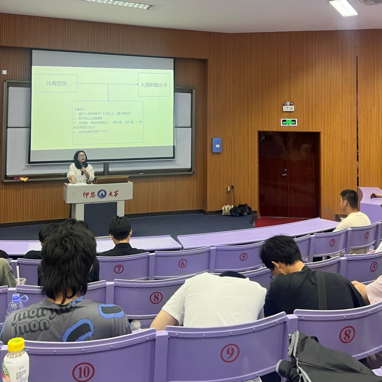 接下来由徐凯迪老师介绍入党流程。从写入党申请书开始,到推优,确定成为积极分子,党课培训和考试,获取党课结业证书,确定发展对象,吸收为预备党员,党课考试,考试通过成为正式党员这一系列流程,进行了详细的介绍。鼓励并呼吁同学们积极向党组织靠拢,奉献属于自己的一份力量。