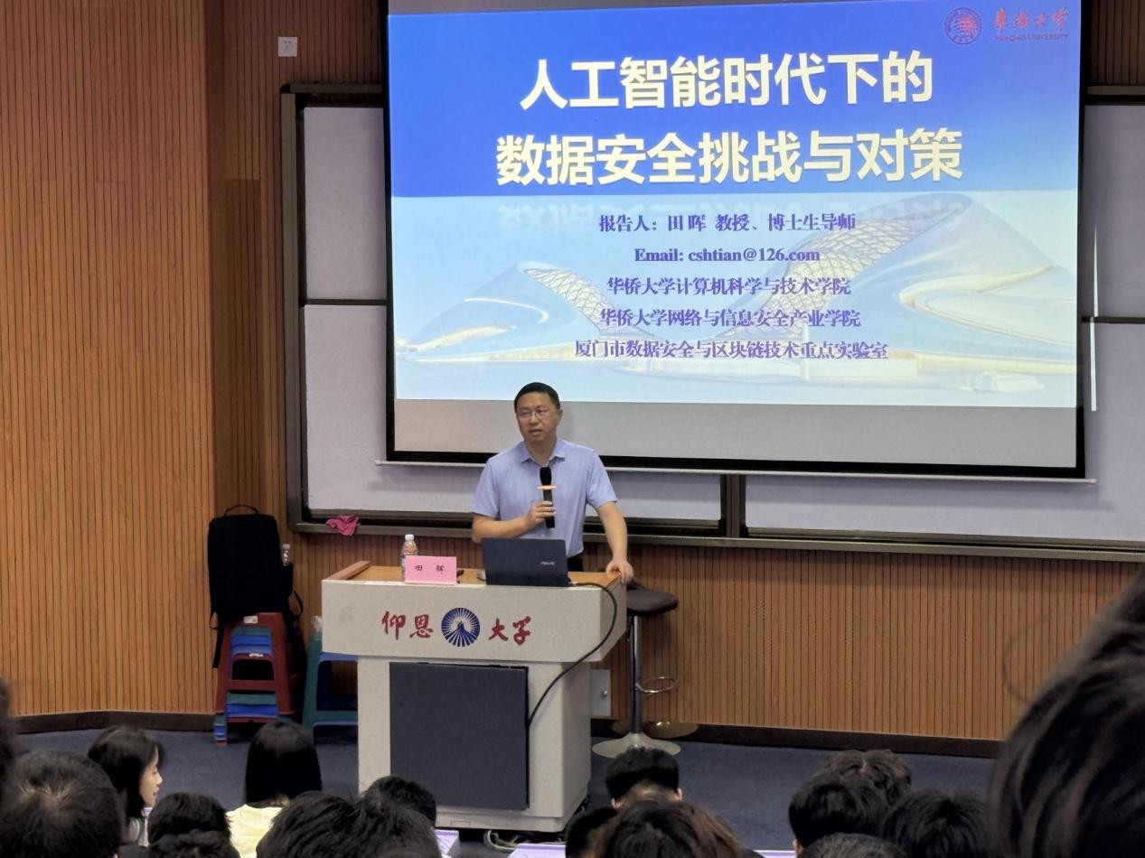 11月4日下午,jinnianhui今年会在和昌教学楼博雅讲堂举办题为“人工智能时代下的数据安全挑战与对策”的主题讲座。华侨大学计算机科学与技术学院院长田晖教授莅临本校进行演讲,jinnianhui今年会师生代表到场聆听。