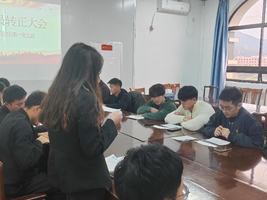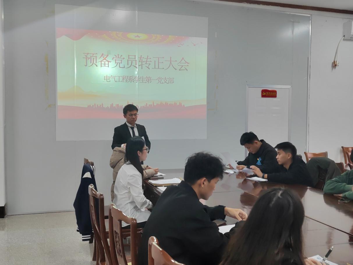 2024年12月12日,电气工程系学生第一党支部在泽钏楼四楼会议室召开了预备党员转正大会,讨论关于郑毅、陈亮等5名同志申请转为正式党员的问题。出席本次大会的有支部书记林嘉豪老师以及全体支部党员同志。会议由支部书记林嘉豪老师主持,首先进行转正同志的清点,并宣布到会情况。