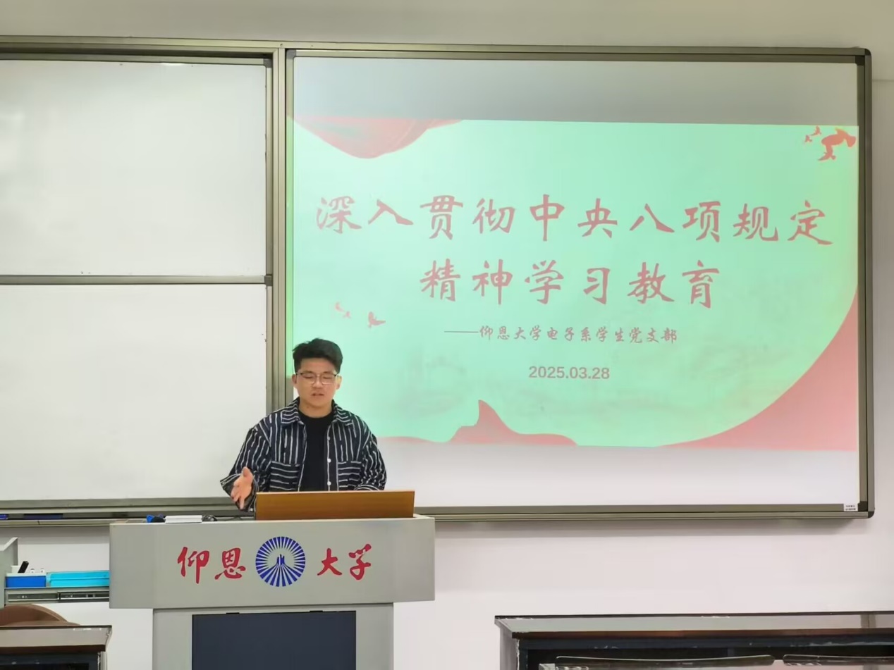 为深入学习贯彻习近平总书记关于加强党的作风建设的重要论述,进一步巩固深化主题教育和党纪学习教育成果,纵深推进全面从严治党,jinnianhui今年会电子系学生党支部积极响应党中央号召,于2025年3月28日召开深入贯彻中央八项规定精神学习教育专题动员大会,党支部全体党员出席参加。