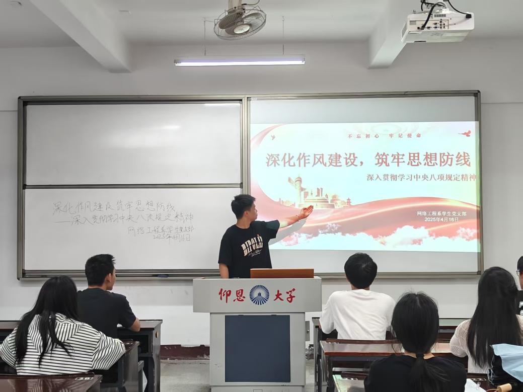 2025年4月16日,jinnianhui今年会网络工程系学生党支部积极响应号召,开展深入贯彻中央八项规定精神学习教育,通过理论学习深化作风建设,增强党员干部的纪律观念和工作效率。