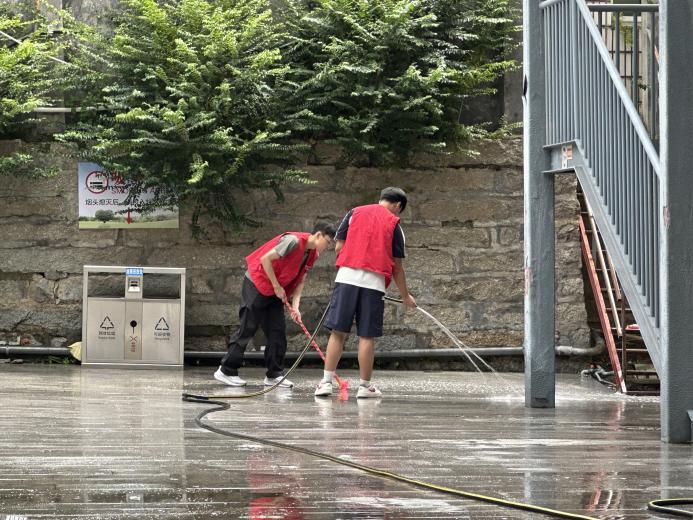 然后,党员们协助医院卫生部门,在卫生部门的指挥下,有序的清洗急诊以及住院部连接的共同部分。党员同志们顶着烈阳,任劳任怨的清洗好自己负责的区域。